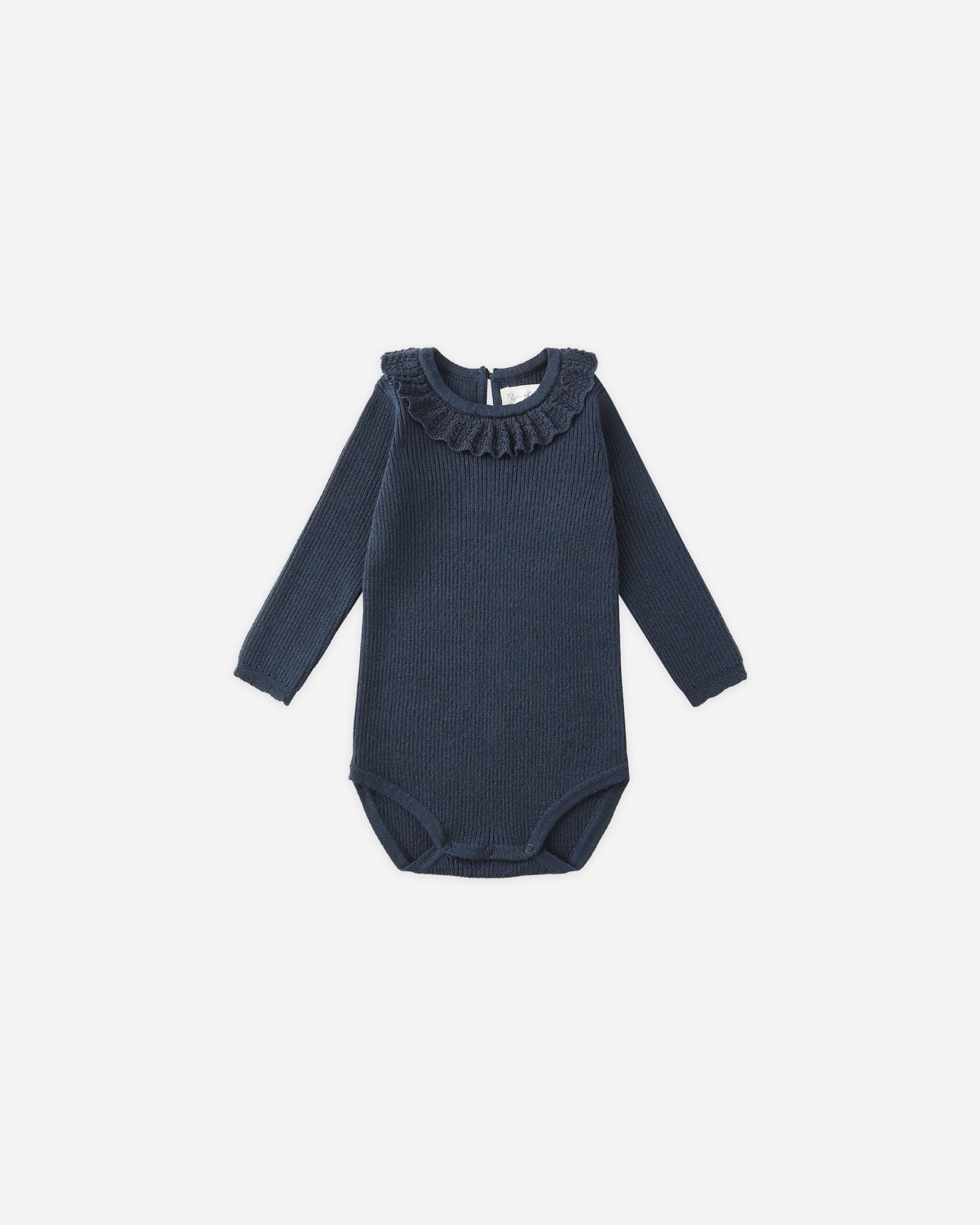 An essential for your little one, this darling knit bodysuit features a sweet ruffle collar, back keyhole button closure, and bottom snaps for effortless changes. Perfect for layering all season long.